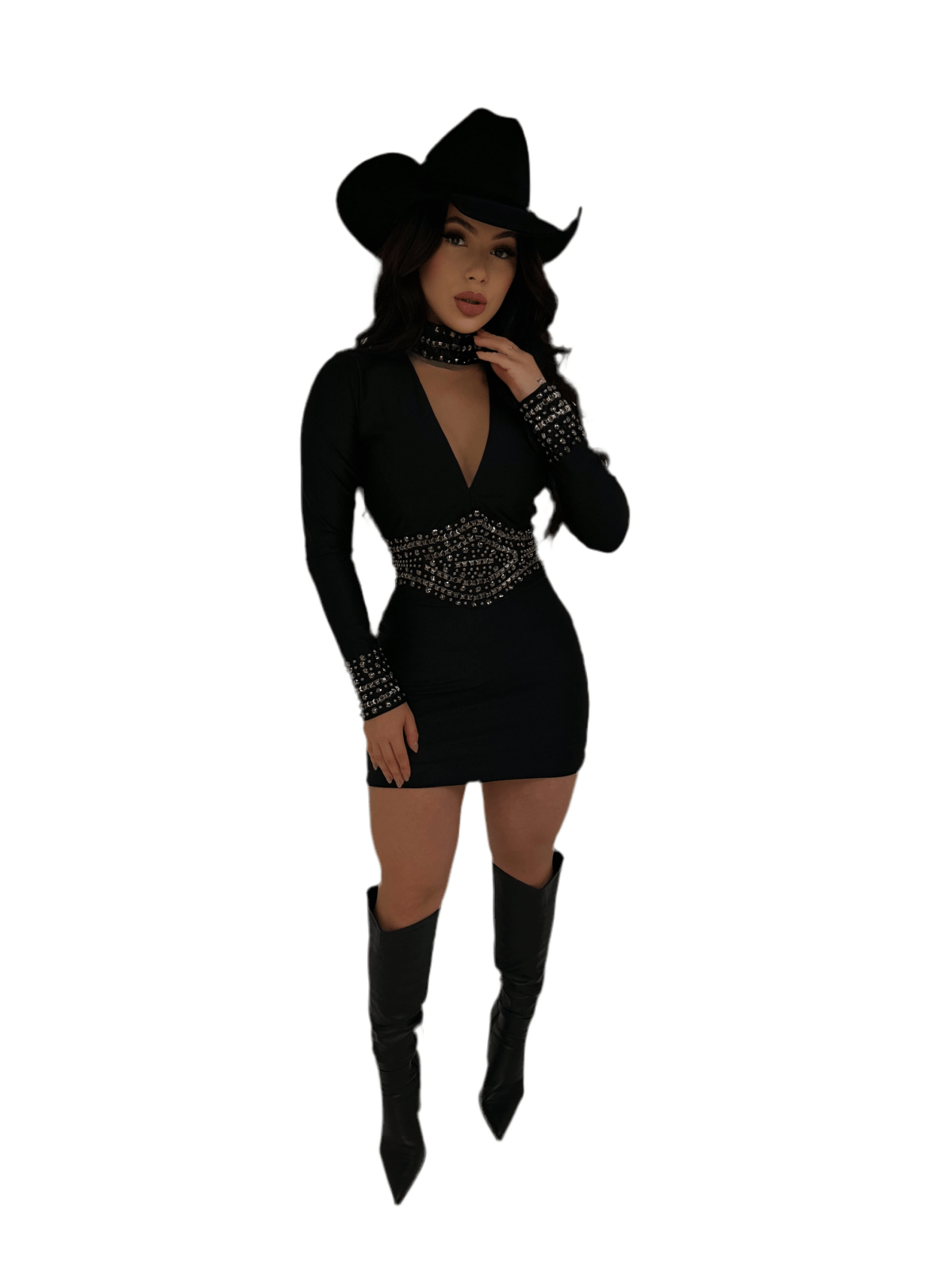 Vestido Curto Preto Manga Longa Isa | Decote Costas, Franja e Pedrarias