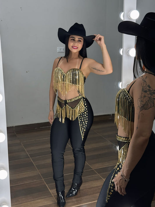 Conjunto Country Feminino Festa | Calça Flare e Cropped com Franjas de Strass