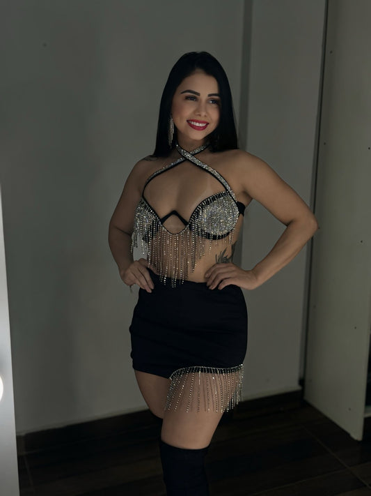 Conjunto Scarlet – Cropped com Franjas de Strass e Saia com Detalhes Brilhantes
