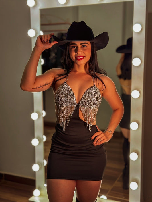 Conjunto Cropped e Saia Strass Franjas Importado | Look Balada e Western
