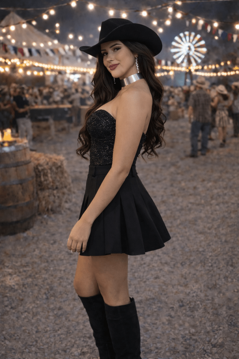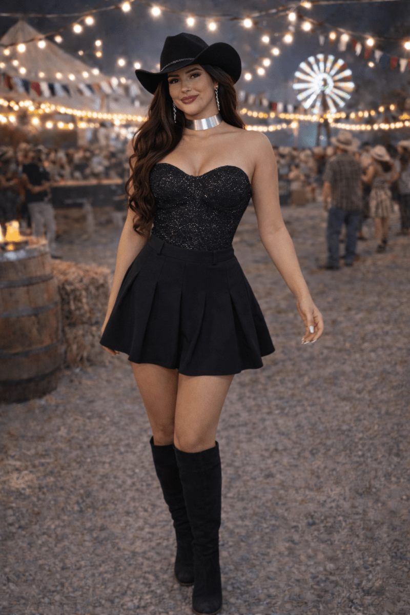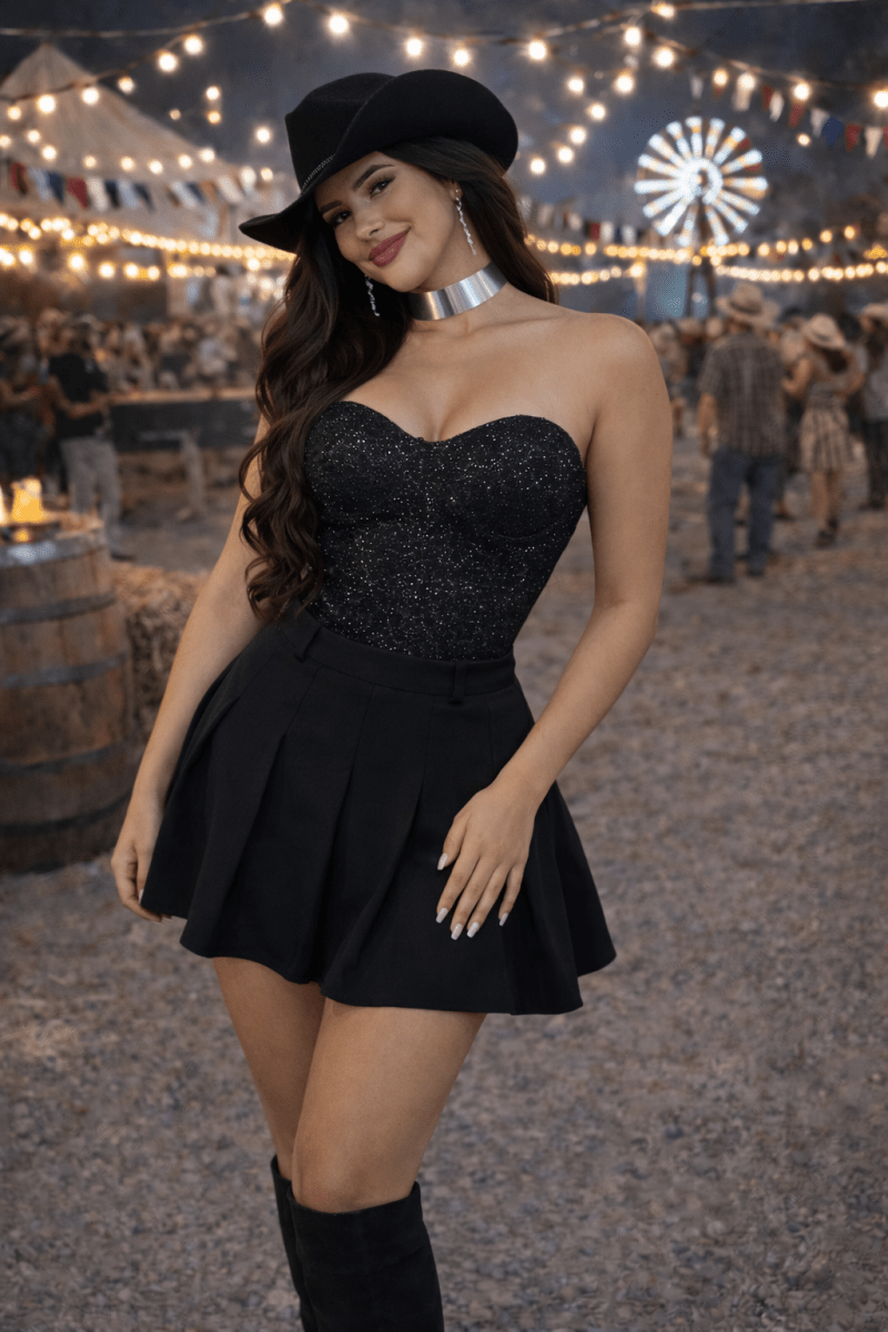 Look Boiadeira Luxo: Combine com a nossa saia curta de couro PU com pregas, bota texana e chapéu para uma produção de rodeio imbatível.