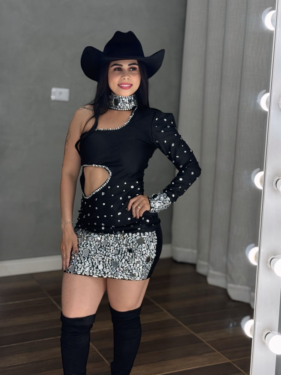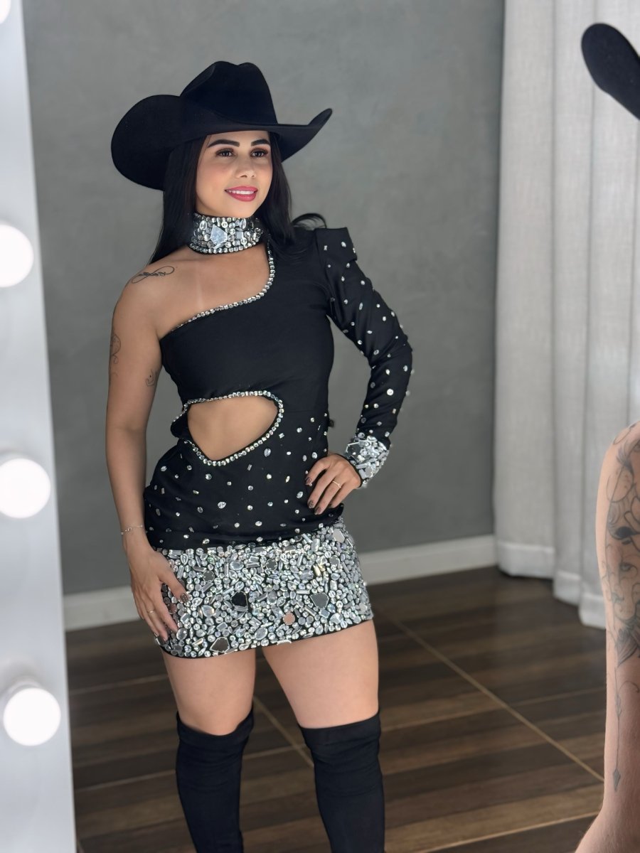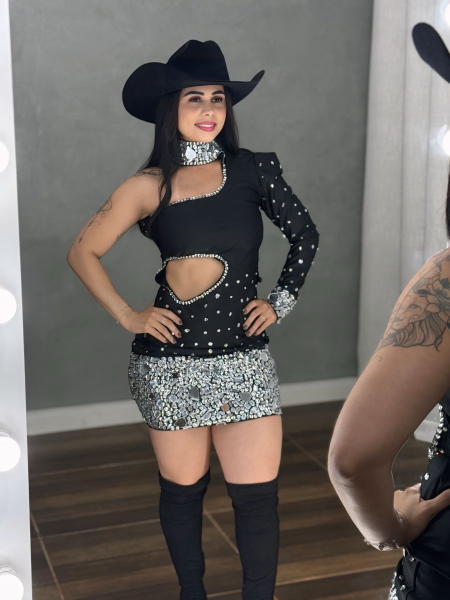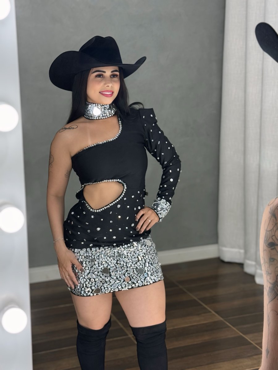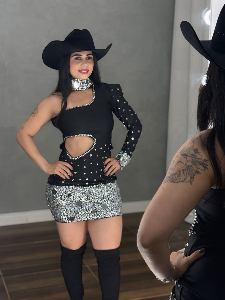 Moda Country Feminina: Combine com botas western de cano longo e chapéu (como na foto) para shows e rodeios.