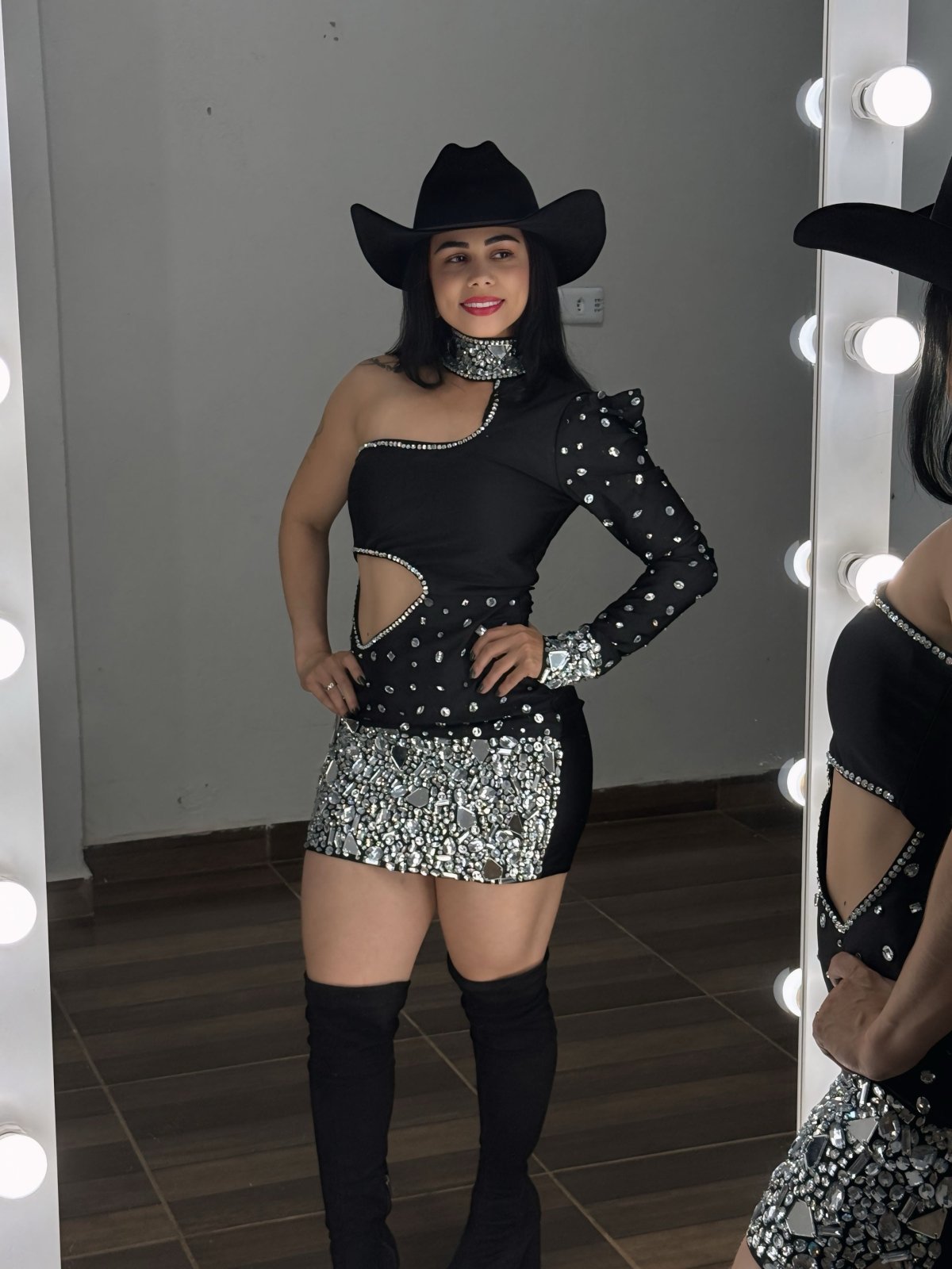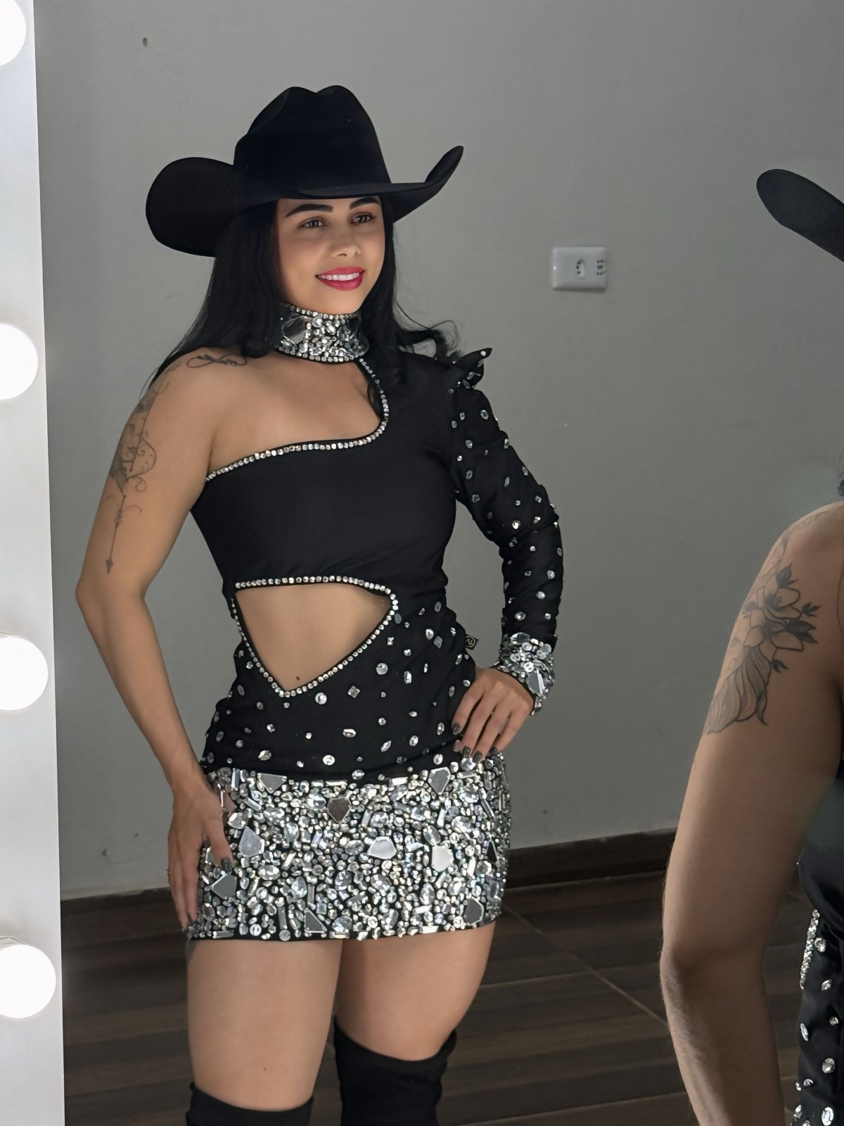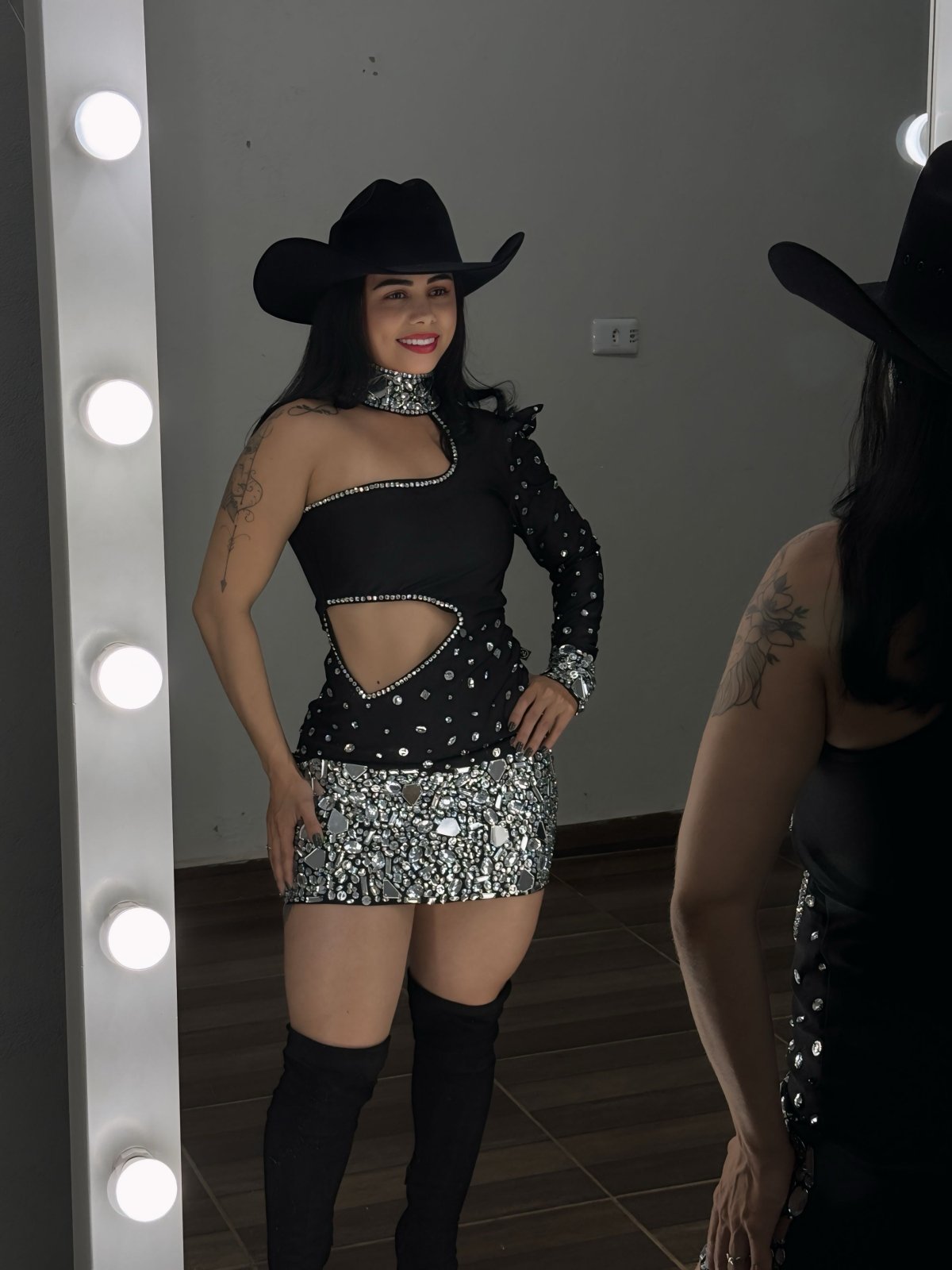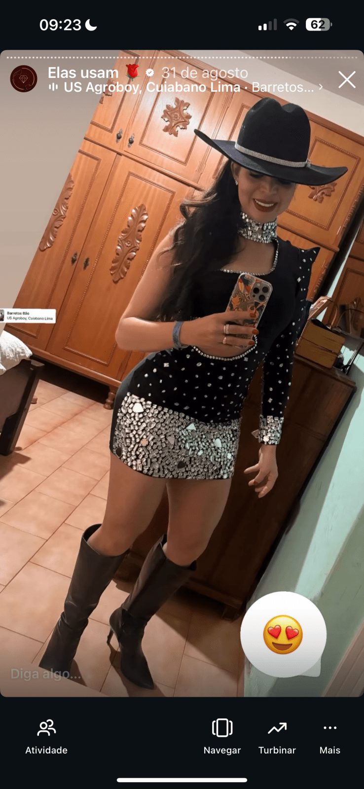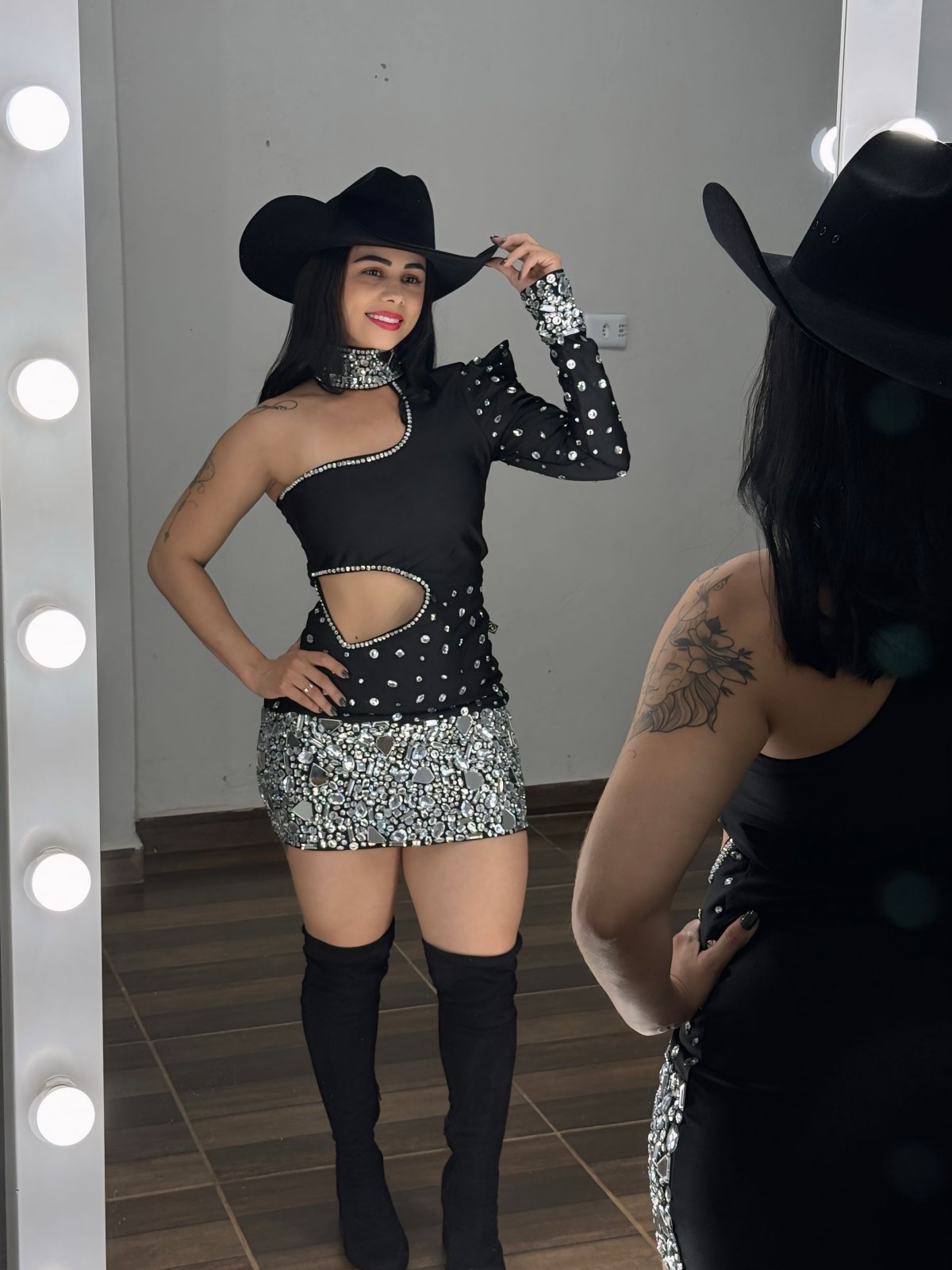 Moda Country Feminina: Combine com botas western de cano longo e chapéu (como na foto) para shows e rodeios.